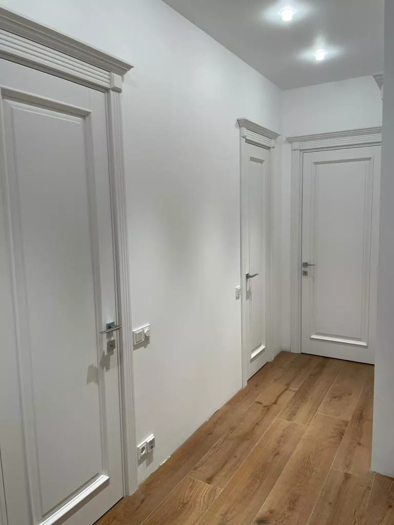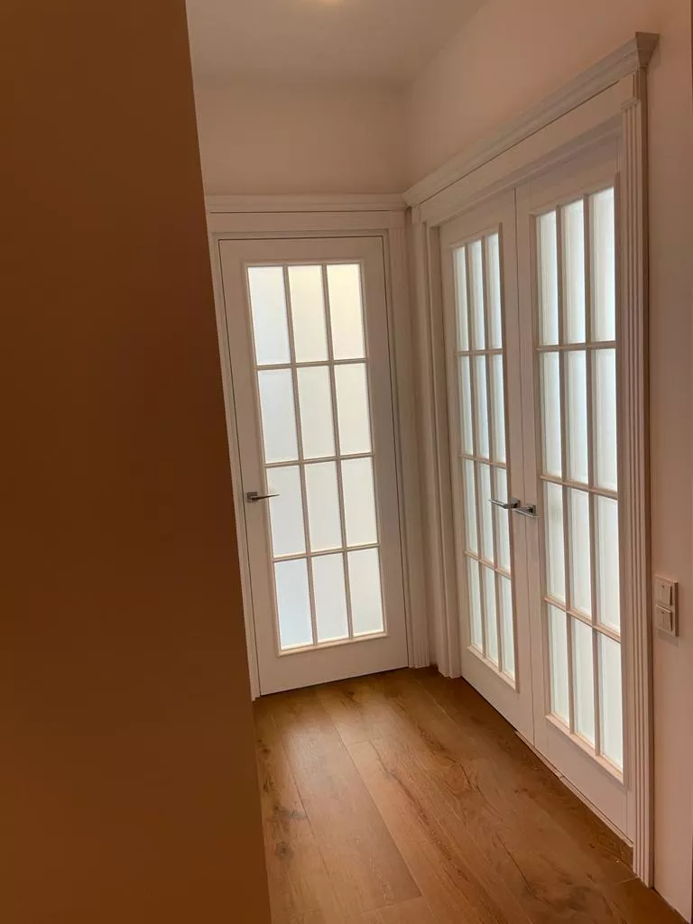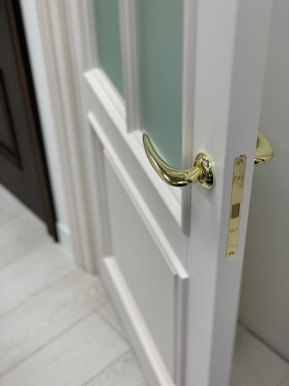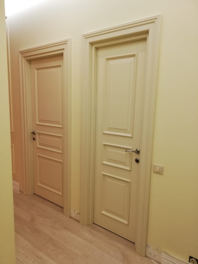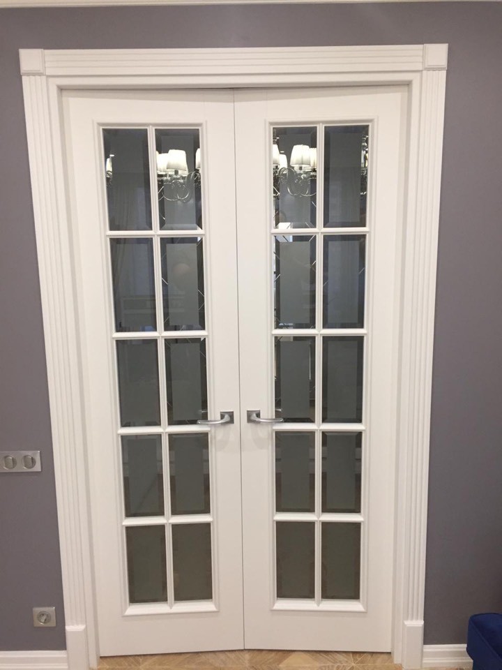 Полотно тамбуратное из инженерного массива (МДФ + ламельный/листельный массив лиственных пород) толщиной 50 мм. с повышенной шумоизоляцией,окра шенное матовыми красками итальянского производства SIRCA с эффектом «soft touch» по шкале RAL с возможностью двусторонней окраски. Объемные филенки, стекла крепятся к полотну с помощью фигурных штапиков (багетов).