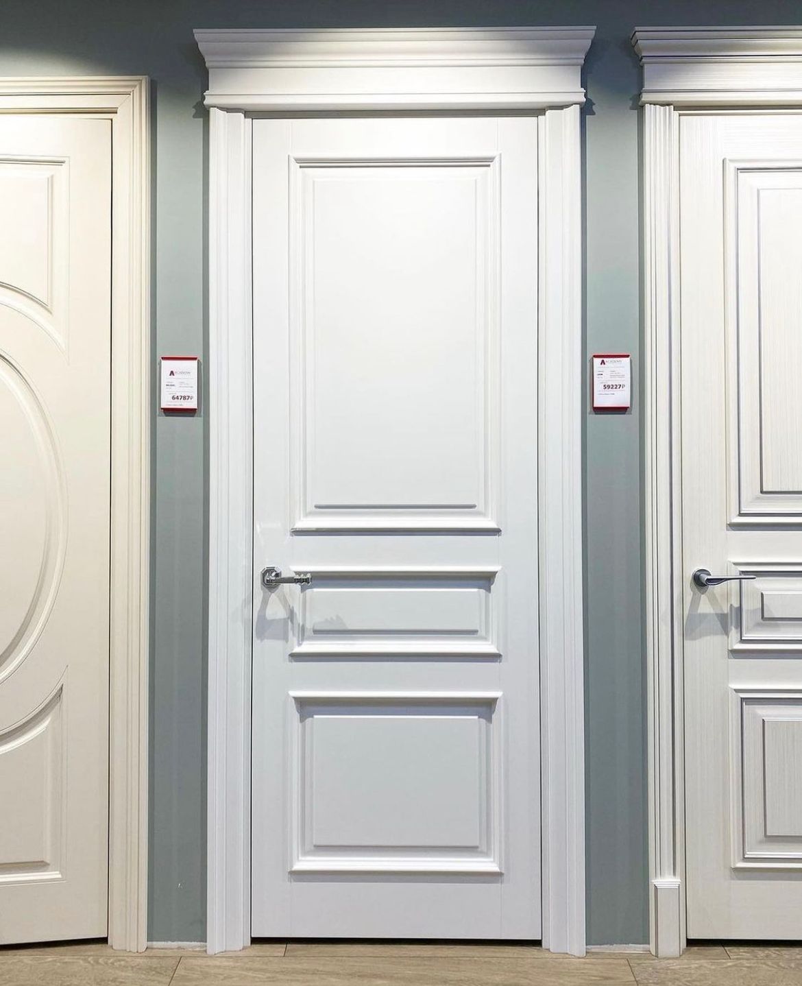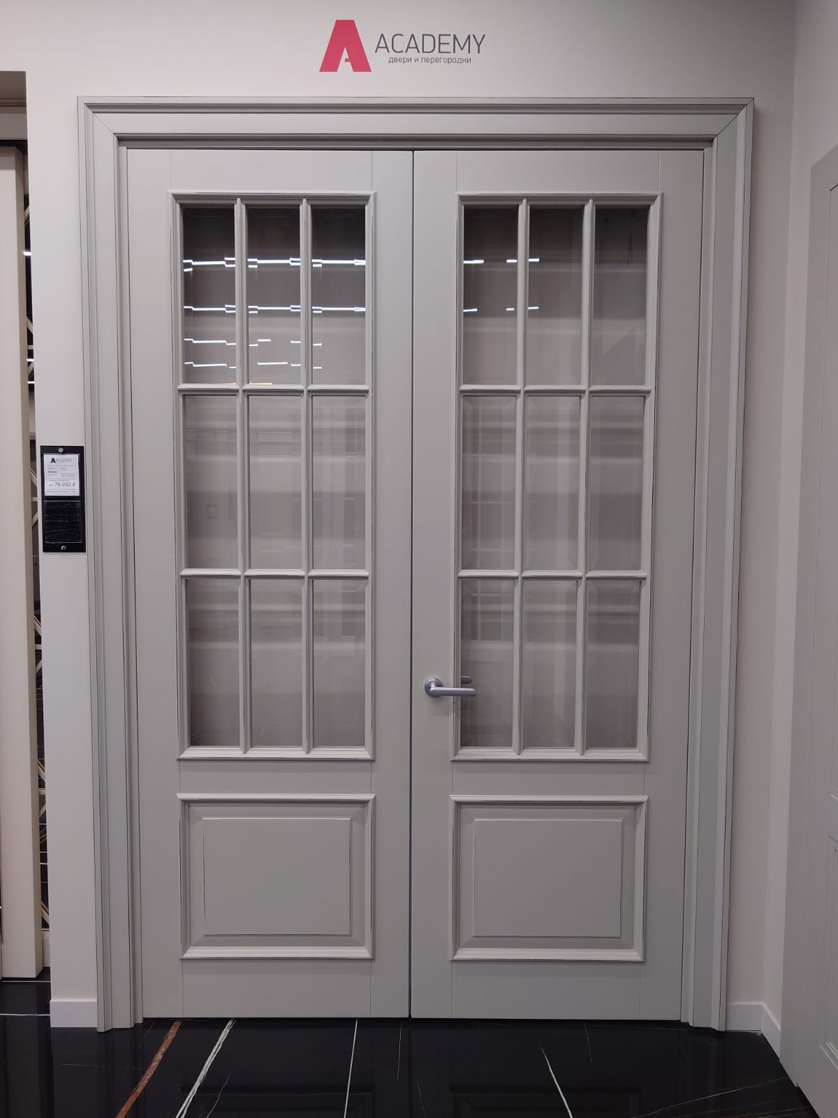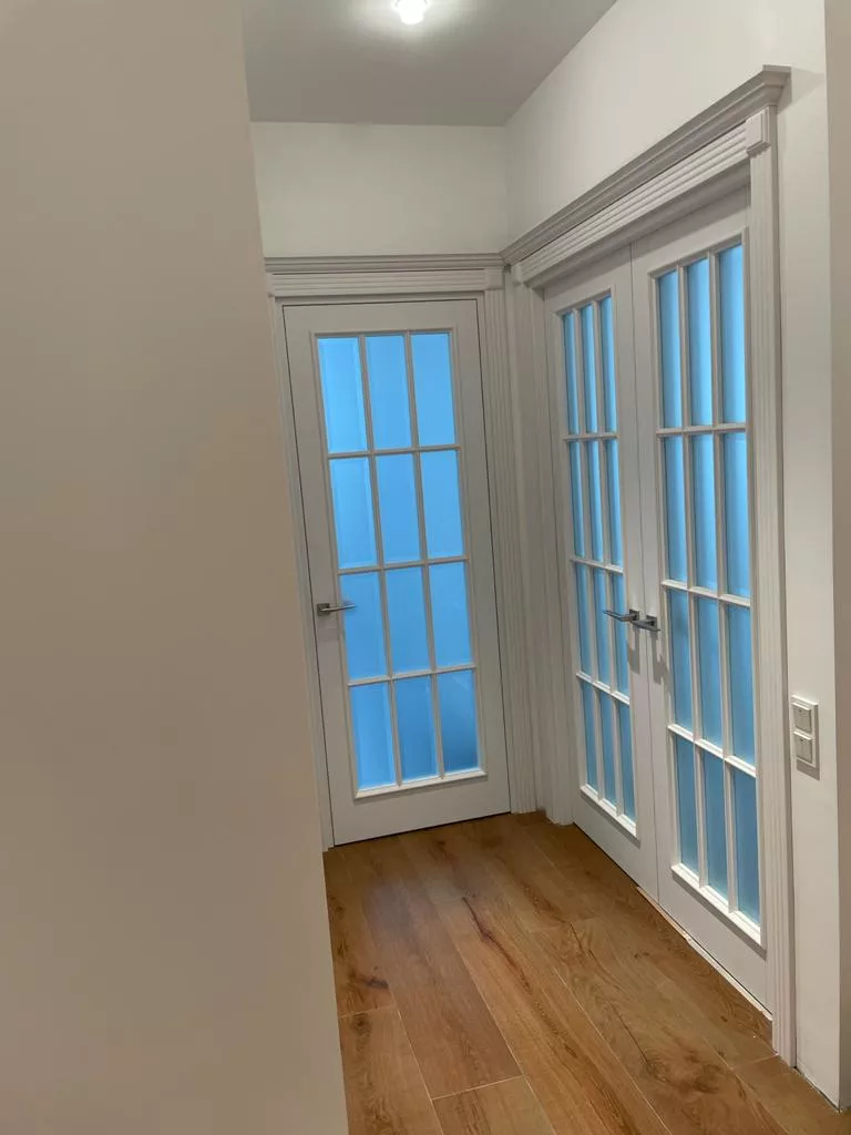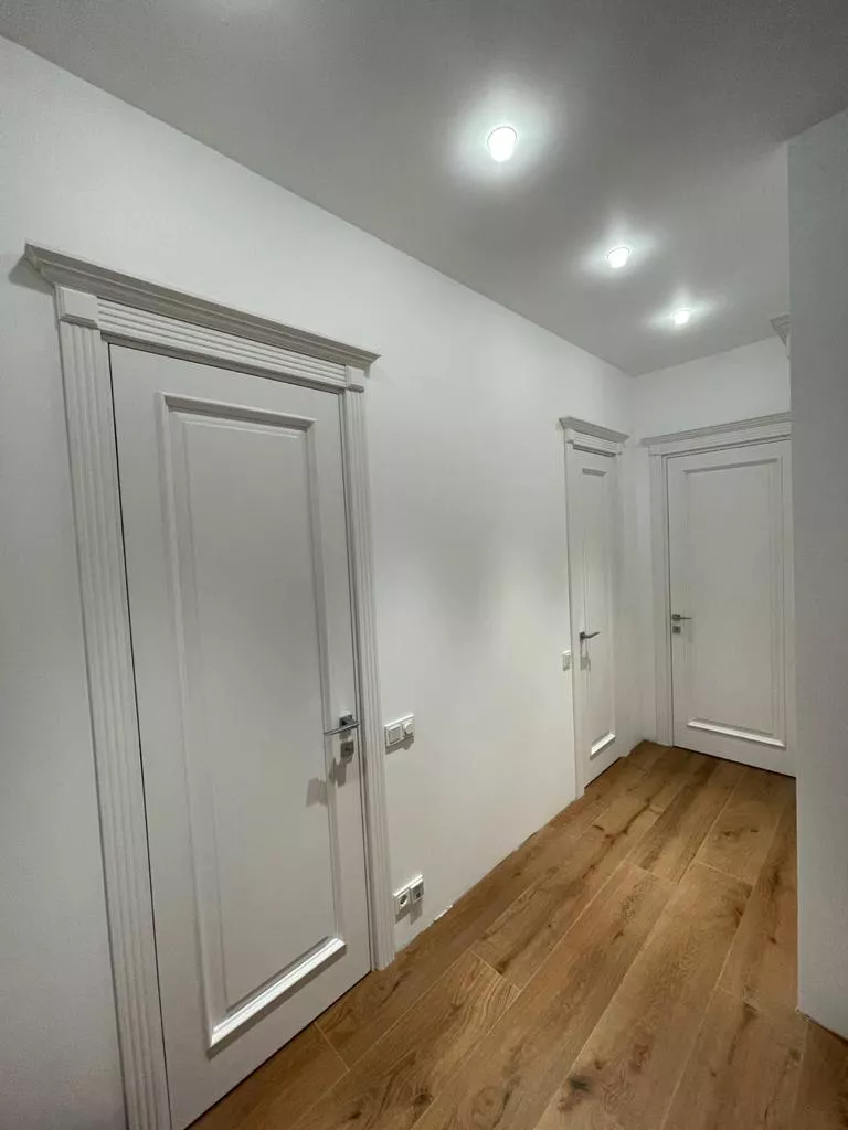 Полотно тамбуратное из инженерного массива (МДФ + ламельный/листельный массив лиственных пород) толщиной 50 мм. с повышенной шумоизоляцией,окра шенное матовыми красками итальянского производства SIRCA с эффектом «soft touch» по шкале RAL с возможностью двусторонней окраски. Объемные филенки, стекла крепятся к полотну с помощью фигурных штапиков (багетов).