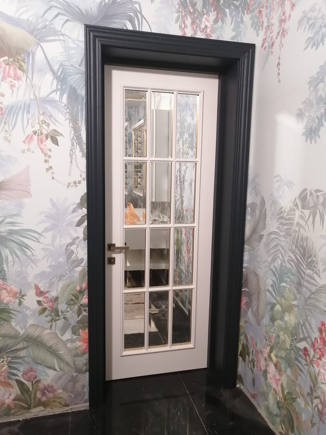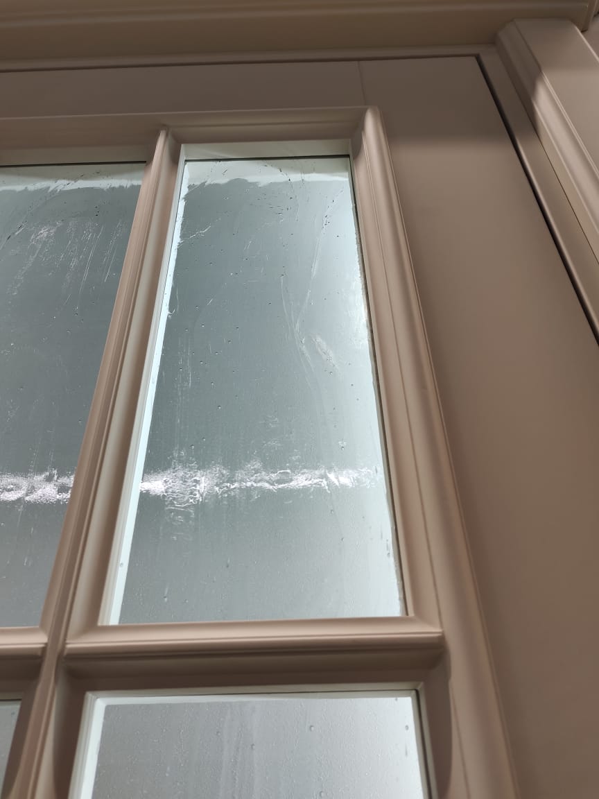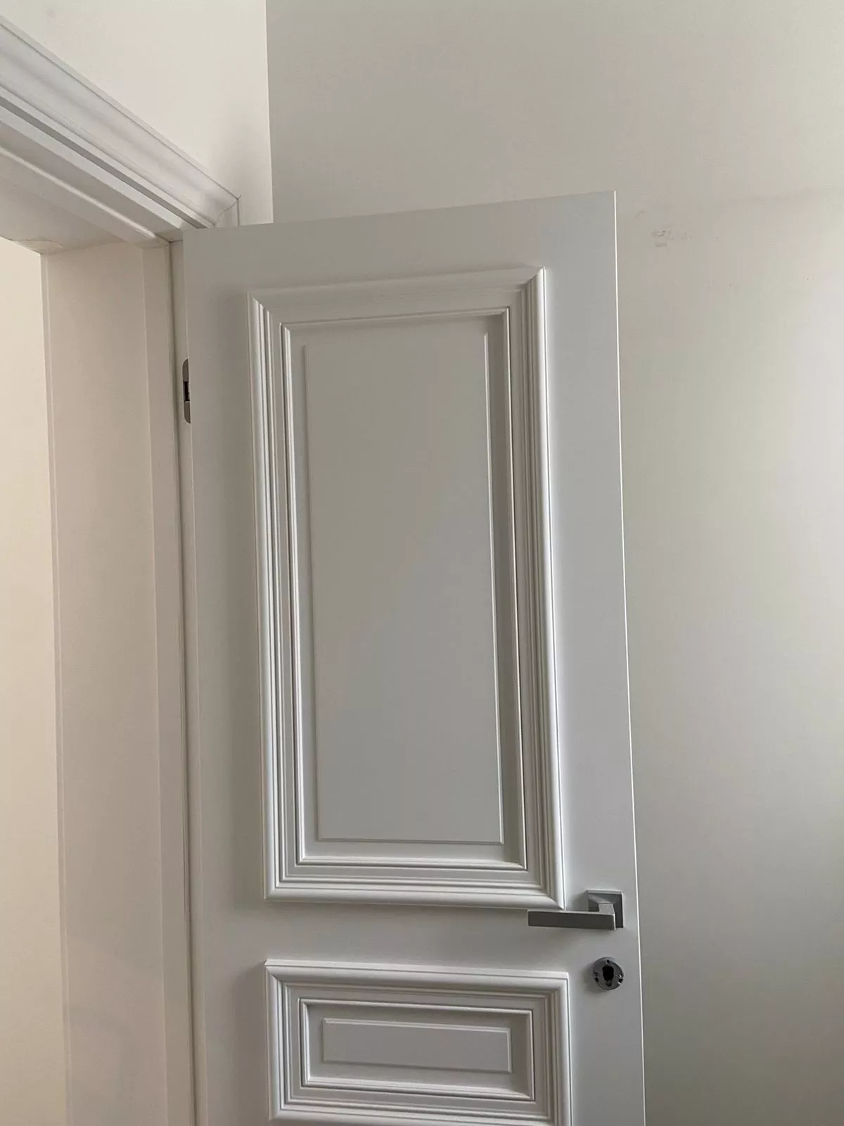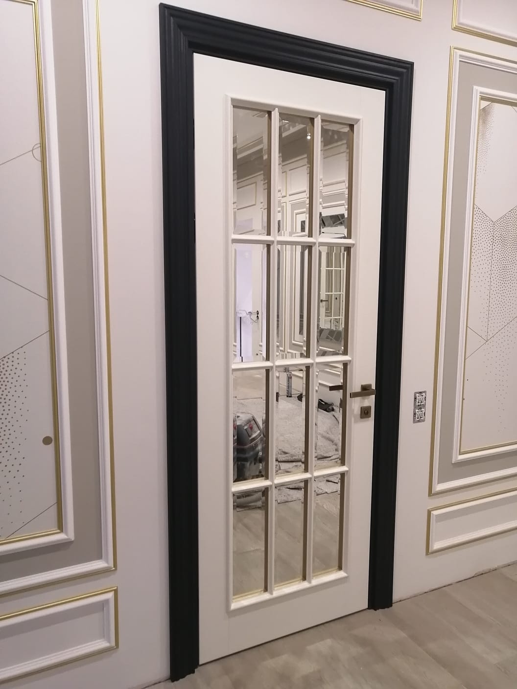 Полотно тамбуратное из инженерного массива (МДФ + ламельный/листельный массив лиственных пород) толщиной 50 мм. с повышенной шумоизоляцией,окра шенное матовыми красками итальянского производства SIRCA с эффектом «soft touch» по шкале RAL с возможностью двусторонней окраски. Объемные филенки, стекла крепятся к полотну с помощью фигурных штапиков (багетов).