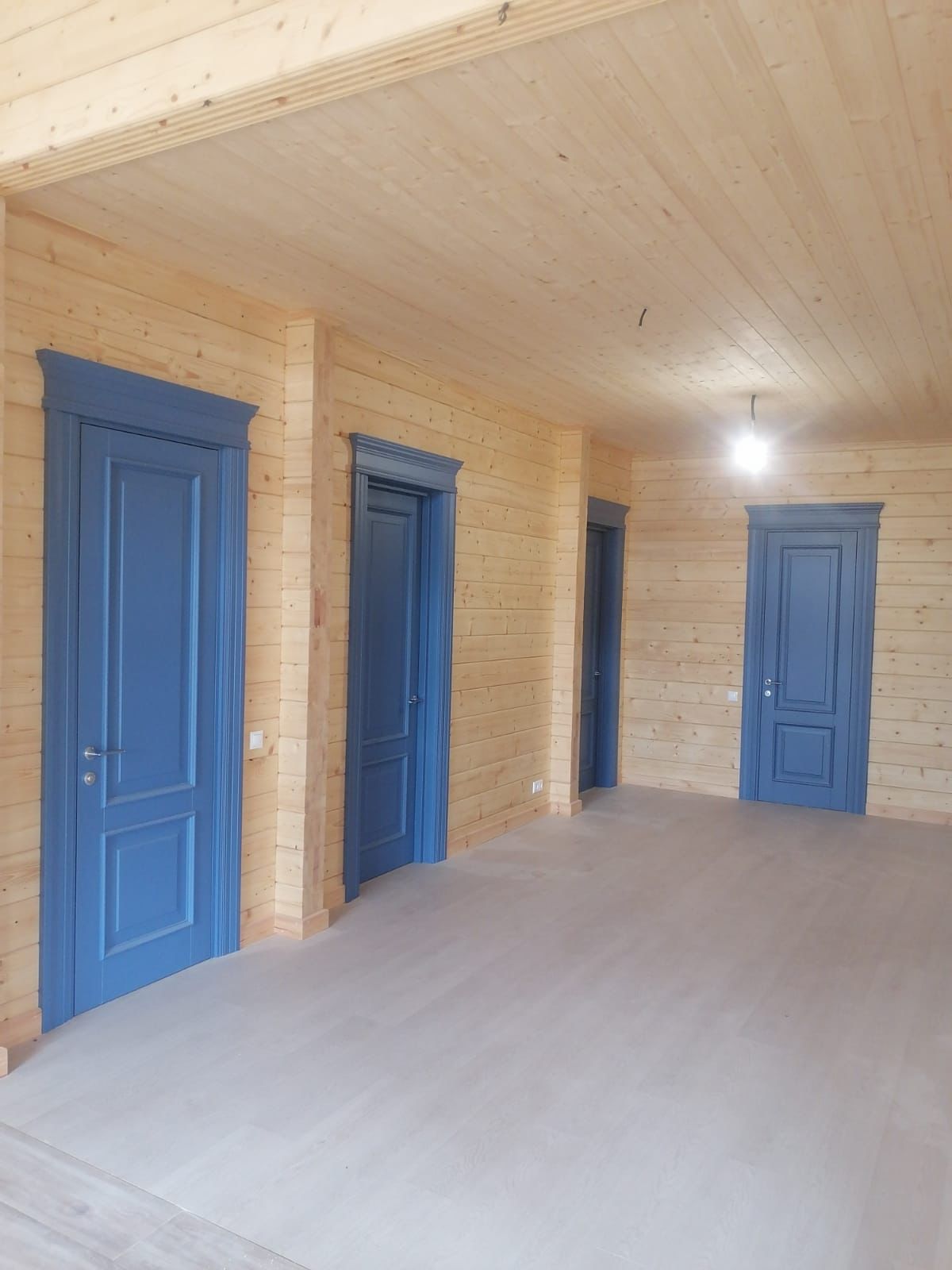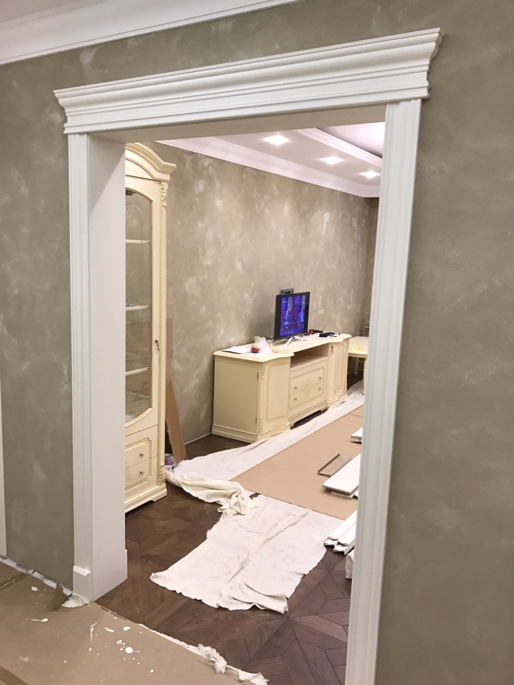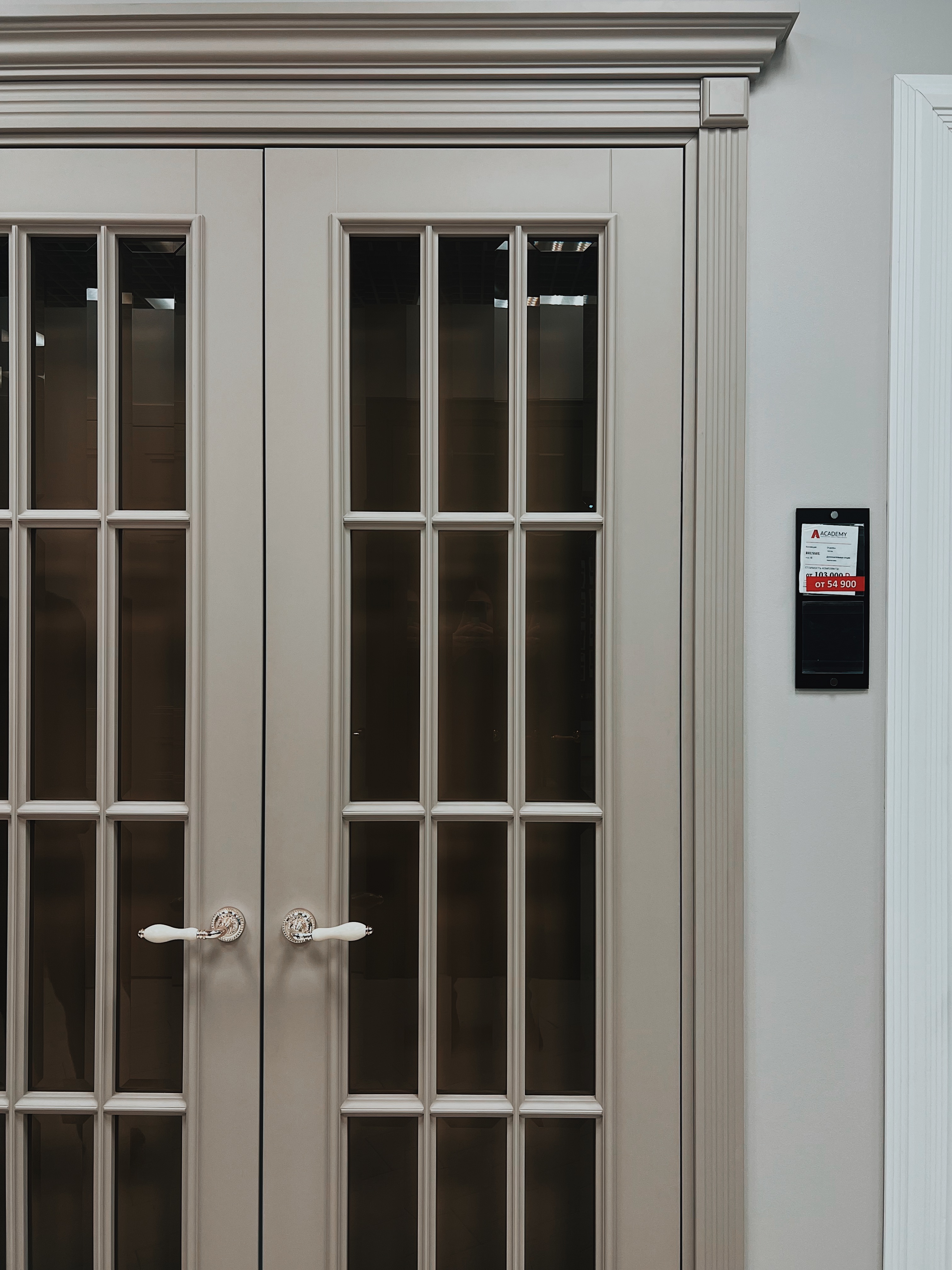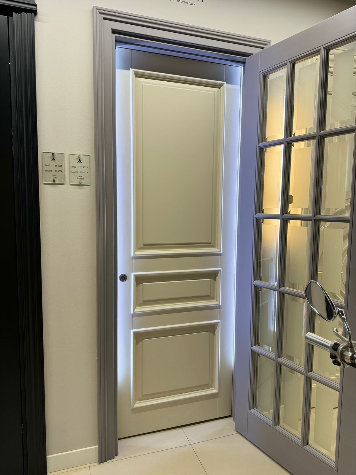 Полотно тамбуратное из инженерного массива (МДФ + ламельный/листельный массив лиственных пород) толщиной 50 мм. с повышенной шумоизоляцией,окра шенное матовыми красками итальянского производства SIRCA с эффектом «soft touch» по шкале RAL с возможностью двусторонней окраски. Объемные филенки, стекла крепятся к полотну с помощью фигурных штапиков (багетов).