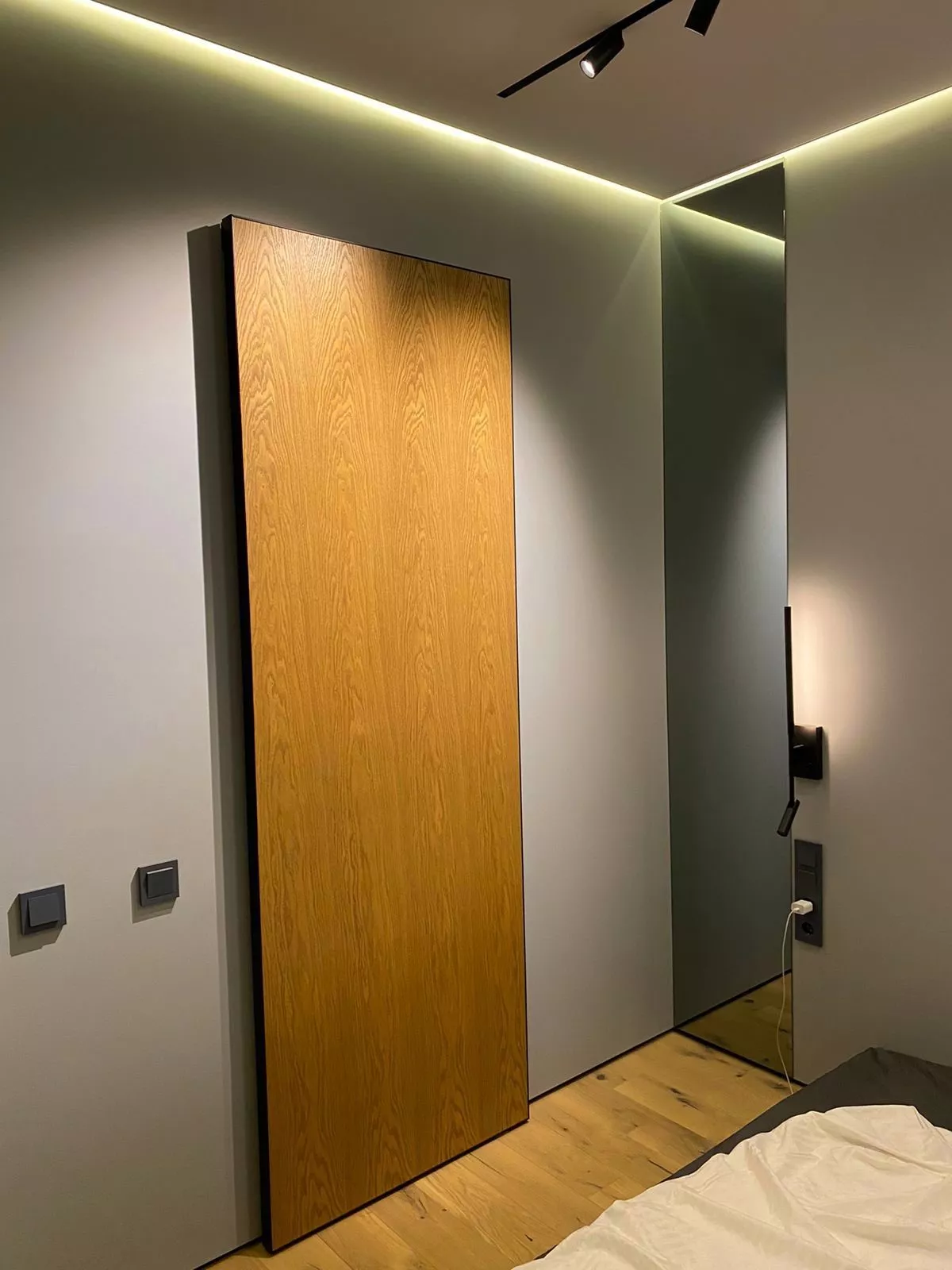 • Реечные двери: Глухие полотна с накладными вертикальными рейками, стеновые панели в идентичной раскладке (эффект «скрытой двери»).